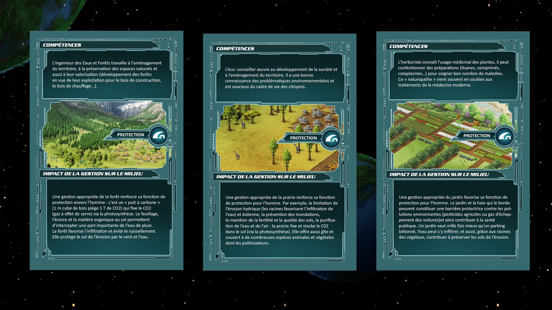The player is invited to solve important ecological problems: apple trees no longer give fruit, there are incursions of wild animals into the vegetable garden … each problem calls for specific ecological concepts and calls for a clean solution. It is up to the player to dive into the database and conduct their survey with the different characters in the game in order to offer the most optimal solution!